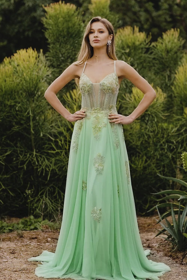 Grünes A-Linie Korsett Pailletten Appliziertes Langes Ballkleid