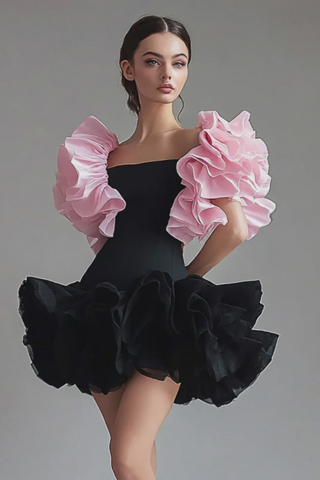 A Line Rüschen Kurze Ärmel Kurzes Schwarzes Kleid