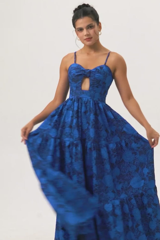 Blumen A Linie Blaues Spaghettiträger Hochzeitsgastkleid