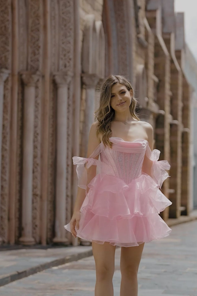 Glitzerndes Rosa Korsett Gestuftes Perlenbesetztes Cocktailkleid mit Trägern