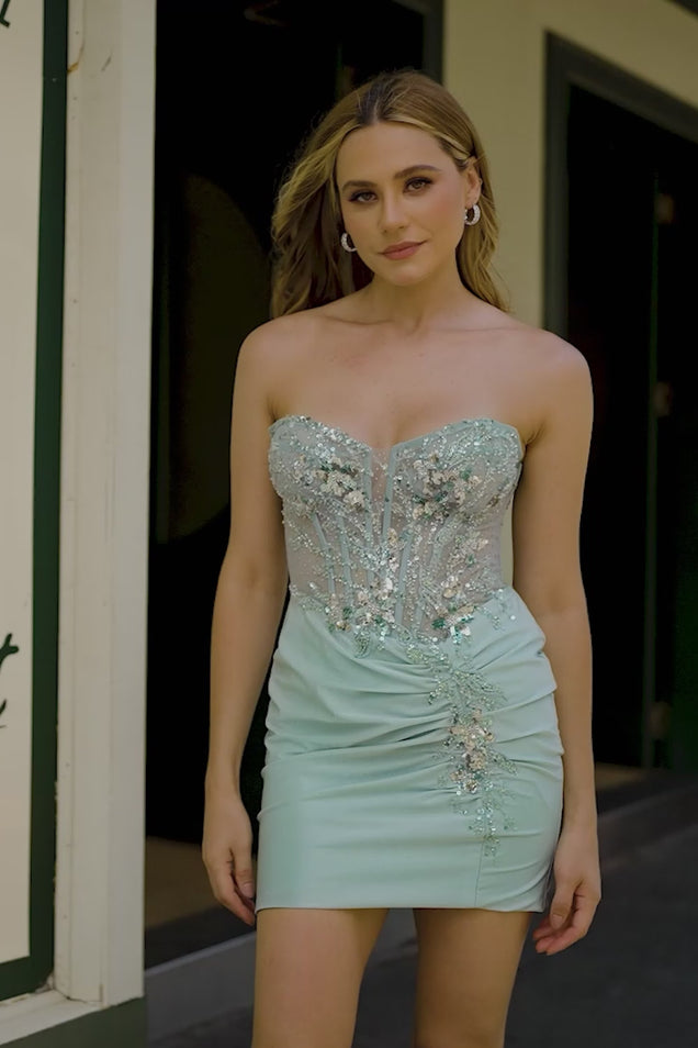 Graugrünes Figurbetontes Trägerloses Abiballkleid mit Pailletten