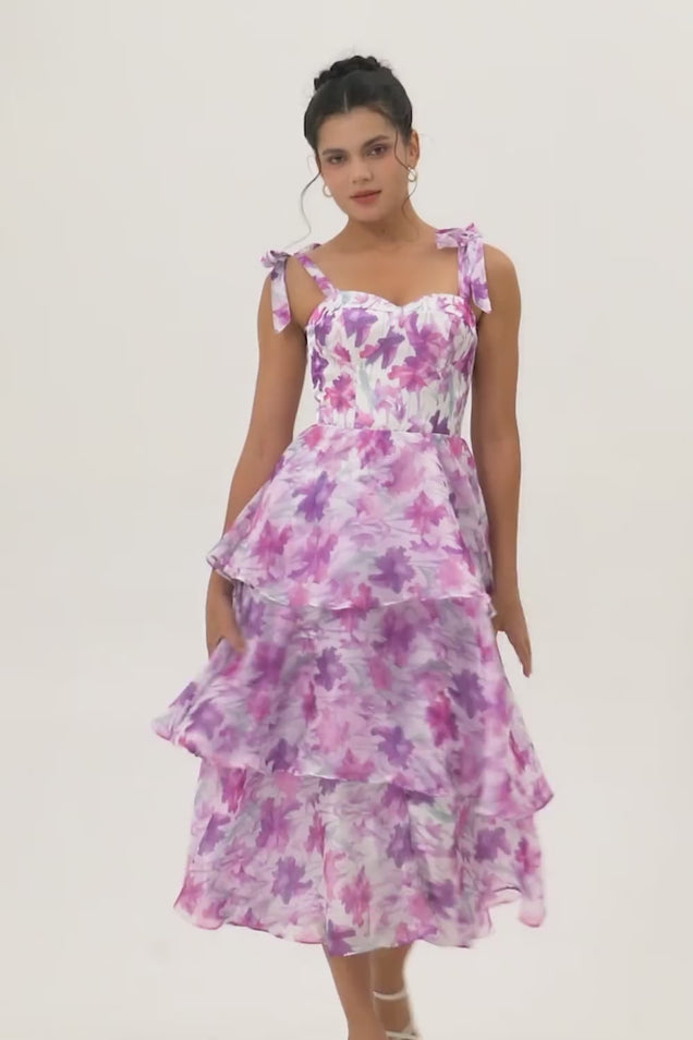 Lila Blume A Linie Gestuftes Langes Hochzeitsgastkleid mit Trägern Schleifen