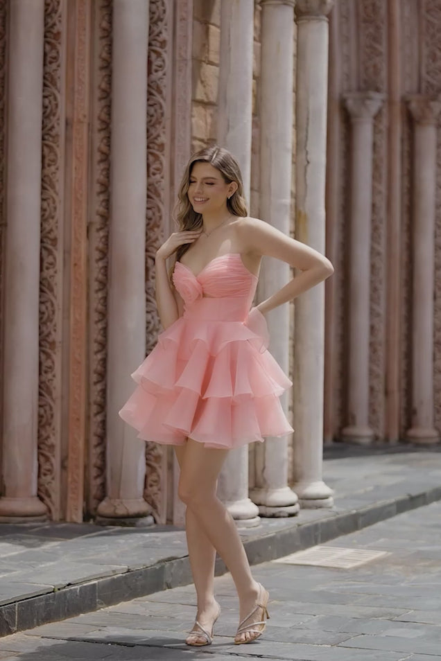 Niedliches Blush Trägerloses A-Linie Gestuftes Kurzes Cocktailkleid