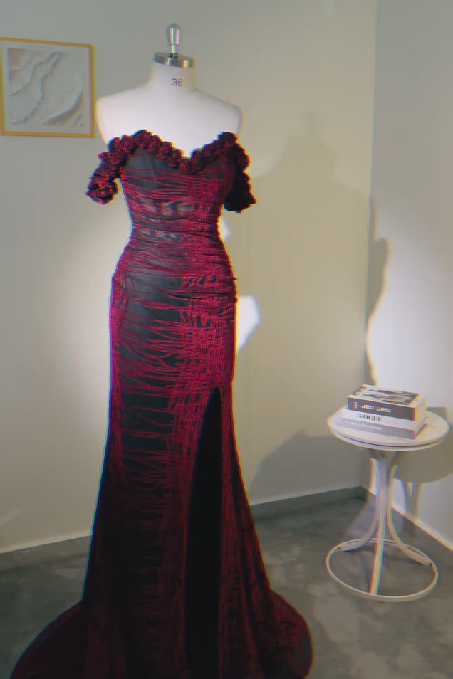 Schwarzrotes Meerjungfrauen Korsett Gerafftes Langes Ballkleid mit Schlitz