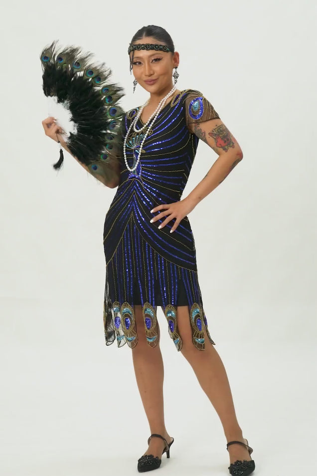 Pailletten Schwarz Blau 1920er Jahre Bodycon Gatsby Kleid mit kurzen Ärmeln