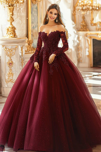 Burgundy Schulterfreies Ball Quinceanera Kleid mit 3/4 Ärmeln