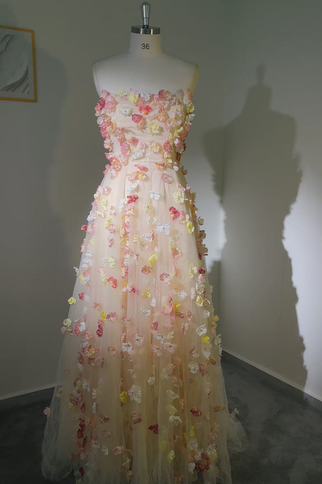 Champagner Trägerloses A-Linie 3D-Blumen Tüll Langes Ballkleid mit abnehmbaren Ärmeln