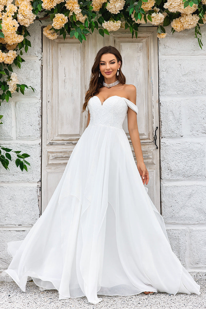 Elegantes schulterfreies elfenbein Chiffon Brautkleid mit Spitze