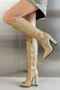 Diese Cowboystiefel mit spitzer Zehenpartie balancieren Mode und Funktionalität perfekt aus und sind von der mittleren Wade bis zum Knie hoch, was sie vielseitig für verschiedene Anlässe macht. Egal, ob es sich um einen lässigen Tagesausflug, ein Western-Event, ein Country-Konzert oder ein klassisches Cowgirl-Outfit handelt, diese modischen Stiefel sind Ihr stilvoller Begleiter.