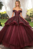 Funkelndes burgunderrotes Ballkleid schulterfrei Rüschen Tüll-Quinceanera-Kleid mit Paillettenapplikationen, süße 16 Kleider, perfekt für Ball-Geburtstagskleider, Quinceanera-Kleider, Ballkleider, formelle Abendbälle, Hochzeiten, Cocktailparty-Festumzüge, Urlaub, Empfang, Tanzparty, Abschlussfeier, Berühmtheit und andere besondere Anlässe.