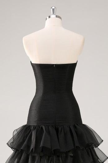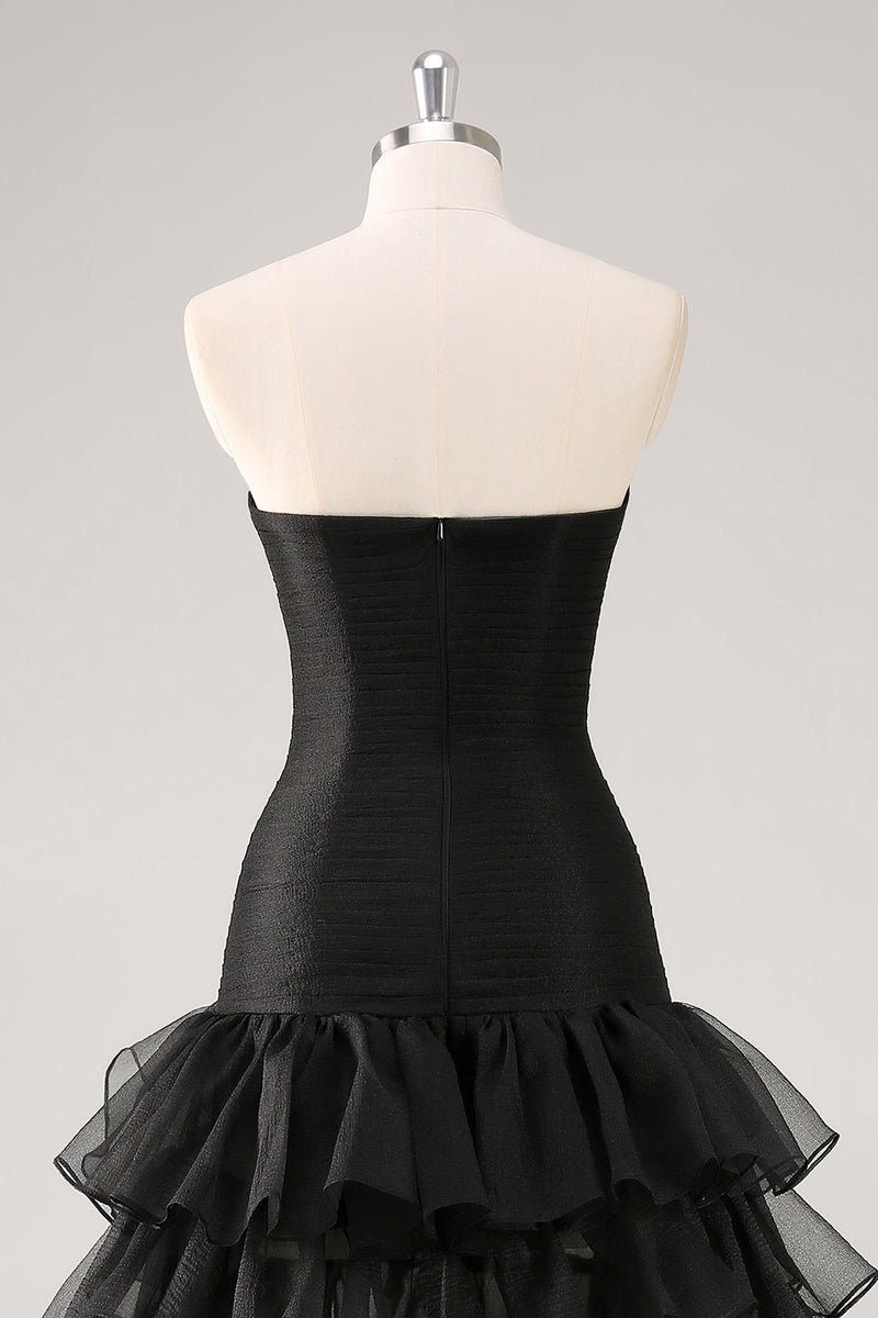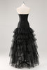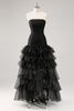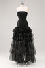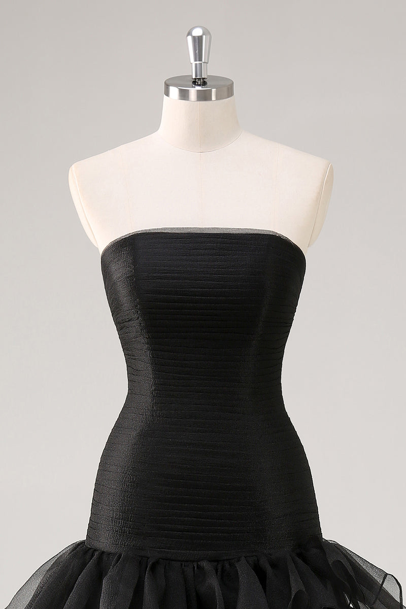 Schwarzes Trägerloses Ballkleid aus Tüll mit gestuften Rüschen