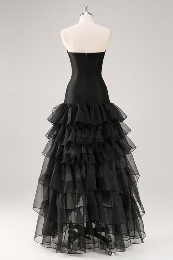 Zapaka Damen Schwarzes Gestuftes Abendkleid mit Schlitz Langes Trägerloses Tüll Rüschen Ballkleid